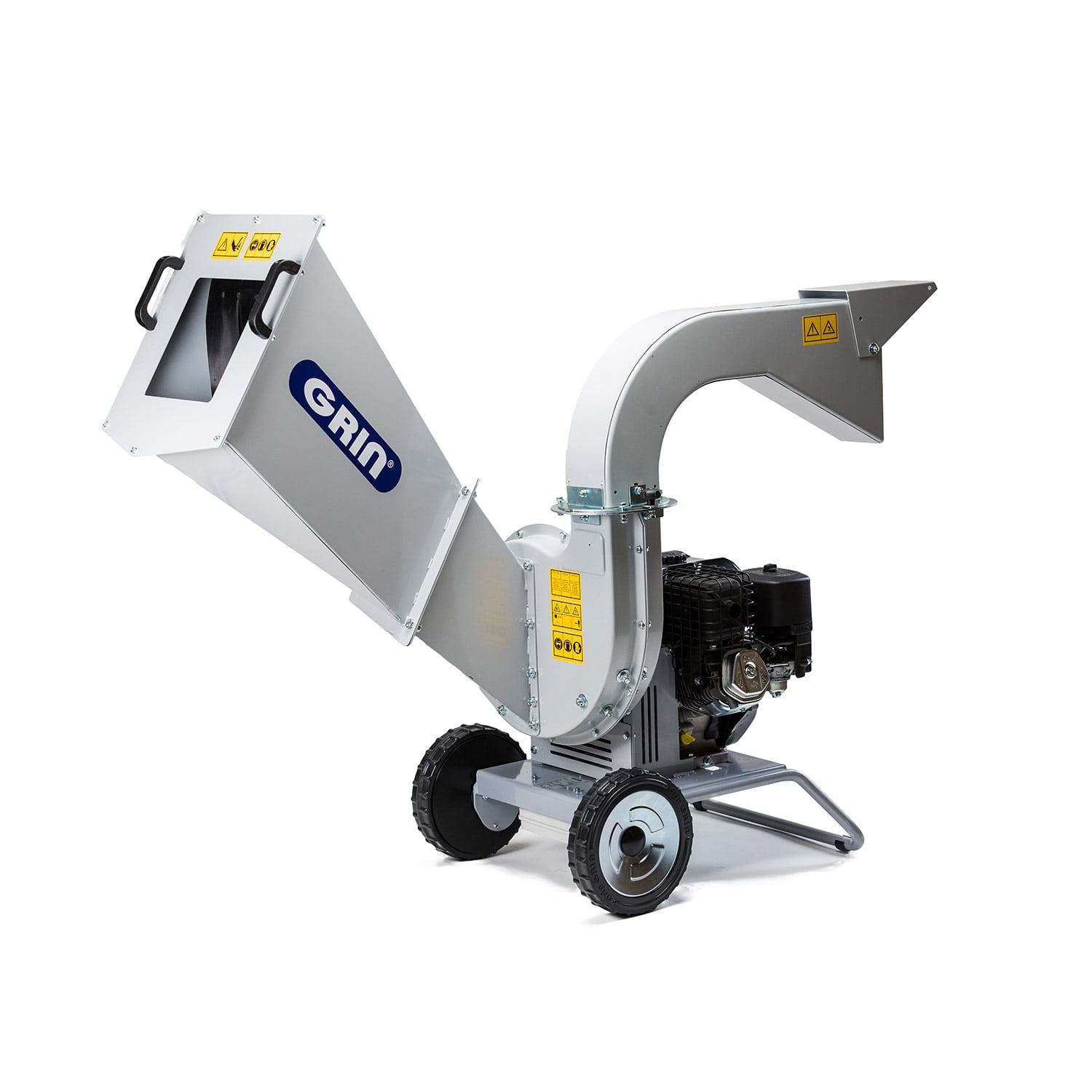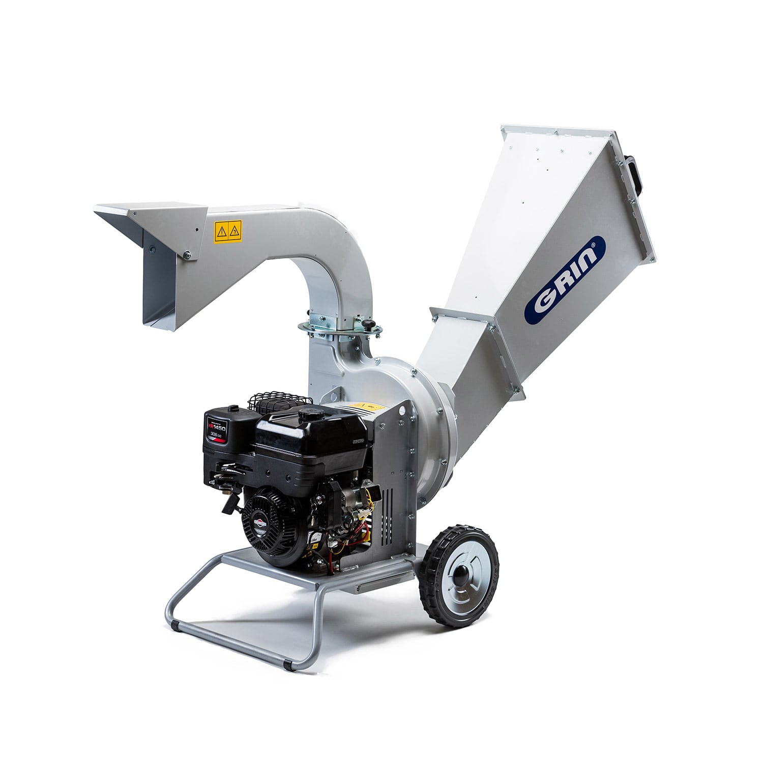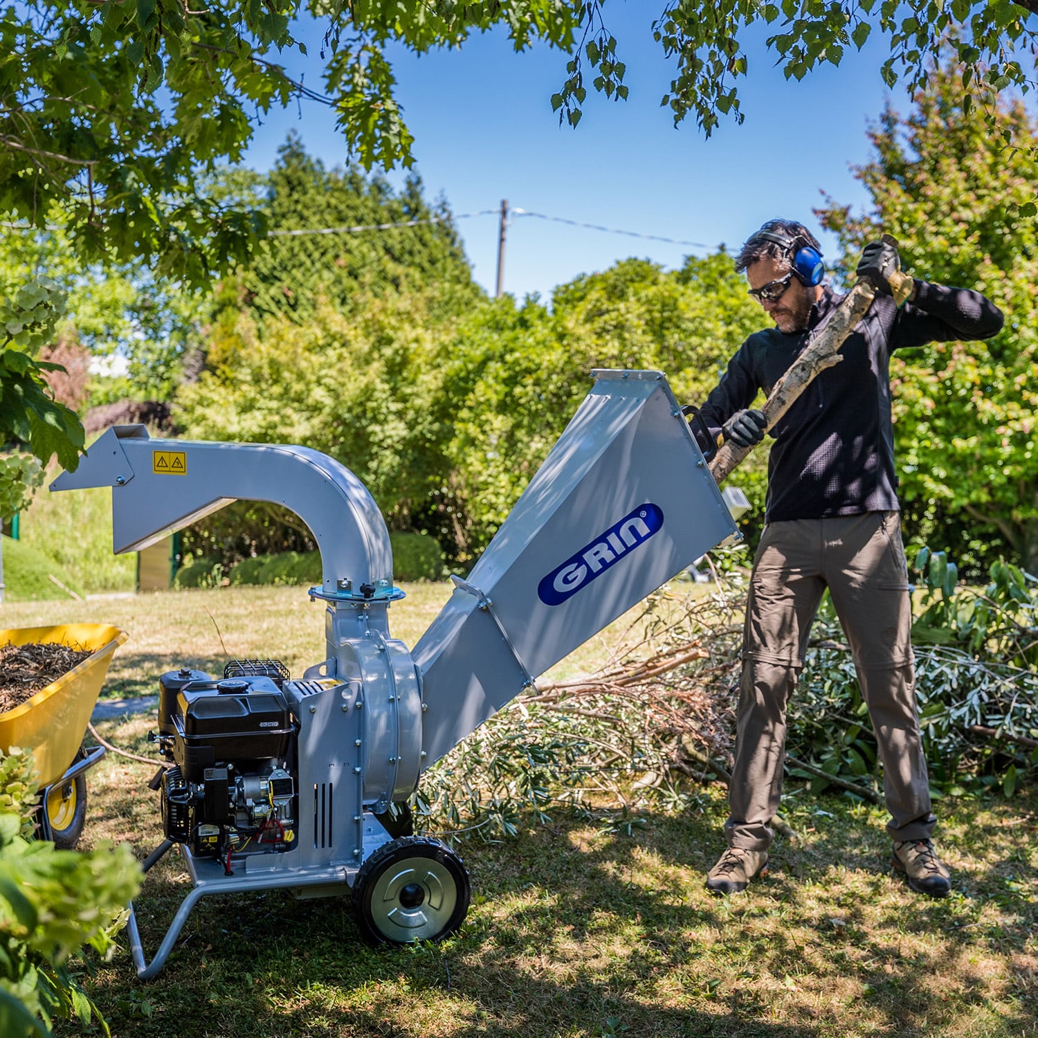 El sistema de picado GRIN de disco de 340 mm, con 2 cuchillas y 12 martillos, permite procesar rápida y finamente todo tipo de poda, incluso la más fibrosa, para convertirla en un excelente mantillo. La estructura de acero garantiza durabilidad y rendimiento incluso con un uso intensivo, y está diseñada para ser muy maniobrable gracias a las grandes ruedas antipinchazos GRIP GRIN y a las prácticas asas de transporte. La tolva ancha y alta permite cargar mucho material y garantiza la seguridad del usuario. La descarga, que puede girar 270 grados con un sistema de ajuste rápido, es muy amplia y permite descargar el material procesado directamente en una furgoneta o carro.