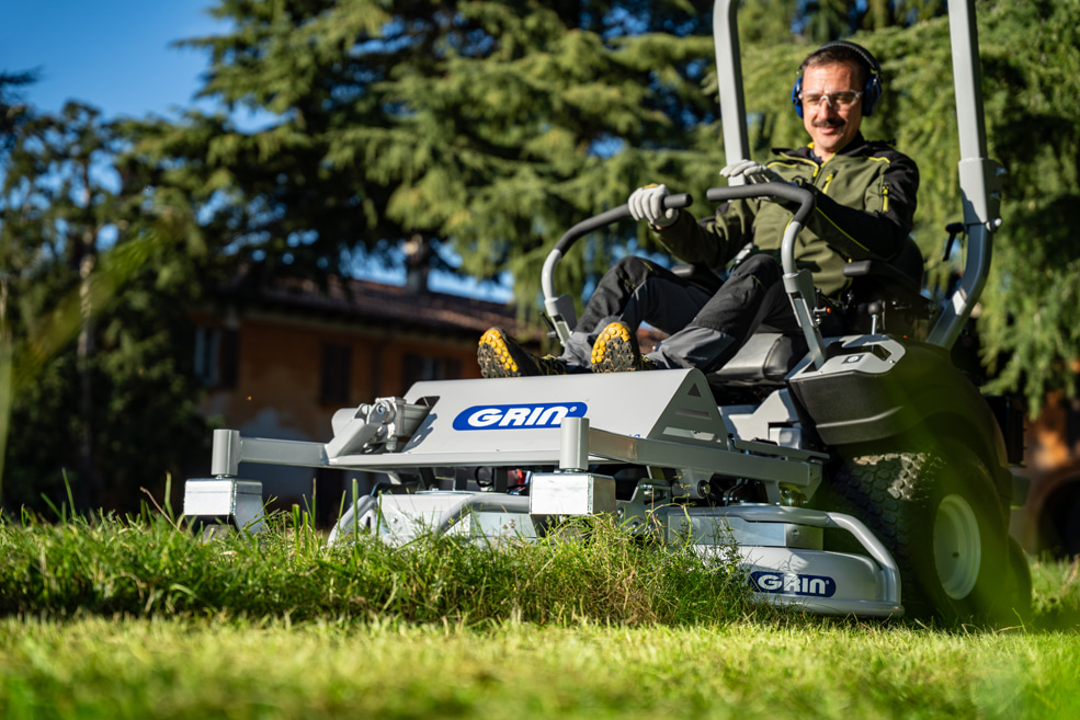 Grin diseña, fabrica y monta sus productos siguiendo altos estándares de calidad: bastidor y carcasa de acero de 3 mm, cono de protección del motor contra impactos accidentales, tracción profesional, ruedas de acero, ajuste centralizado de la altura de corte, asa plegable, son sólo algunos de sus puntos fuertes.